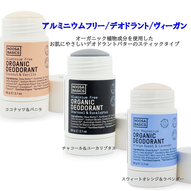 ★オーガニック植物成分を使用した、お肌にやさしいデオドラントバター 人気フレーバーのスティックタイプです。石油由来原料不使用! タピオカパウダーとカオリンクレイが、汗や余分な皮脂を吸収し、お肌はさらりと快適なまま。 気になるニオイを抑えながら、高保湿成分シアバターがお肌に潤いを与え、 心地よいナチュラルな香りが広がります。 汗をかいても、成分がやさしくお肌にとどまり、長時間の使用にも◎ 敏感肌にも配慮したオーガニック処方で、1日中すっきりとした気分が続きます。 スティックタイプで片手でサッと使えるのも嬉しいポイント。 毎日のケアに自然と手が伸びる、そんな心地良さをお届けします。 アルミニウム、防腐剤、パラベン、フタル酸エステル、プロピレングリコール、パームオイルフリー。 デオドラントボディバターより、テクスチャーが少し硬めです。 W:40mm、D:40mm、H:90mm・110g ■生産地:オーストラリア ■素材・成分: 【ココナッツ&バニラ 】 シア脂・ヒマワリ種子油・タピオカデンプン・セタノール・炭酸水素Na・キャンデリラロウ・ヤシ油・カオリン・ローズマリー葉油・ユーカリ葉油・ティーツリー葉油・香料 【チャコール&ユーカリプタス】シア脂・ヒマワリ種子油・タピオカデンプン・セタノール・炭酸水素Na・キャンデリラロウ・ヤシ油・カオリン・炭・ローズマリー葉油・ユーカリ葉油・ティーツリー葉油・香料 【スイートオレンジ&ラベンダー】 シア脂・ヒマワリ種子油・タピオカデンプン・セタノール・キャンデリラロウ・カオリン・酸化亜鉛・水酸化Mg・ローズマリー葉油・ユーカリ葉油・スイートオレンジ果皮油・ラベンダー油 ・少量を脇の下に塗布し、しばらく放置して乾かして下さい。 ・お肌に合わない場合はご使用をお止め下さい。 ・目に入ったときはすぐに洗い流して下さい。 ※製品の性質上、かたくなったり、やわらかくなったり、香りが弱く感じる場合がありますが、品質には問題ありません。 ※お肌に合わない場合はご使用をお止め下さい。目に入ったときはすぐに洗い流して下さい。 ※開封後はお早めにご使用下さい ※香りが弱くなることがありますが、品質には問題ありません。 ※使用後はしっかりと蓋を閉め、高温や直射日光を避け、乳幼児の手の届かないところで保管して下さい。 ※高温や直射日光を避け、30度以下での涼しい場所で保管して下さい。 ※パッケージのデザインは予期なく変更となる場合がございます。 ※商品の改良や表示方法の変更などにより、実際の成分と一部異なる場合があります。 実際の成分は製品の表示をご覧下さい。 内容をご理解の上お買い求めください。