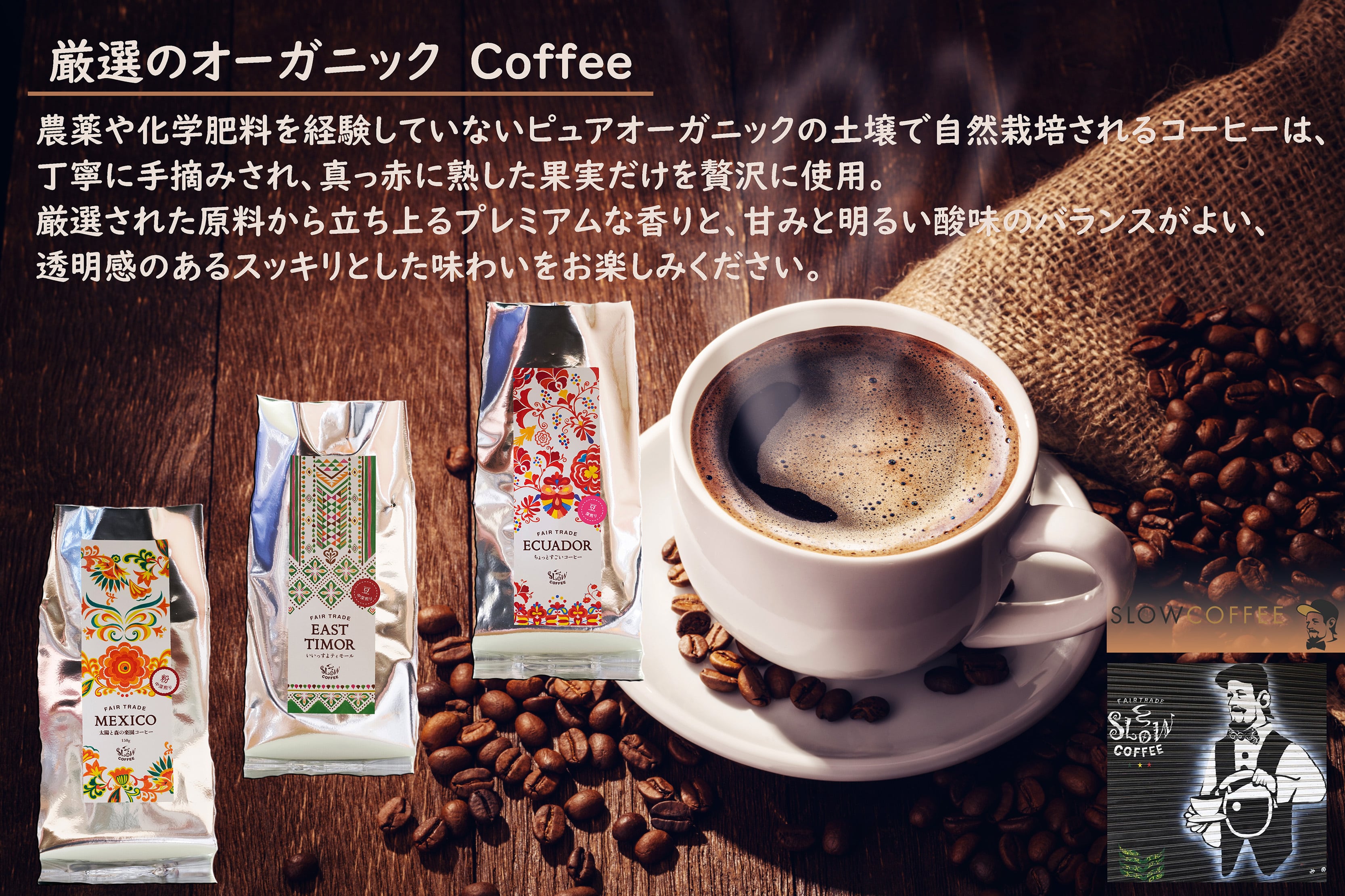 そんな願いを込めて、SlowCoffeeは【フェアトレード】で輸入された、良質な【オーガニック】コーヒー豆のみを、【自社で焙煎】しています。 おいしいコーヒーをお届けするためには、この3つのどれもが欠かせないと考えているからです。