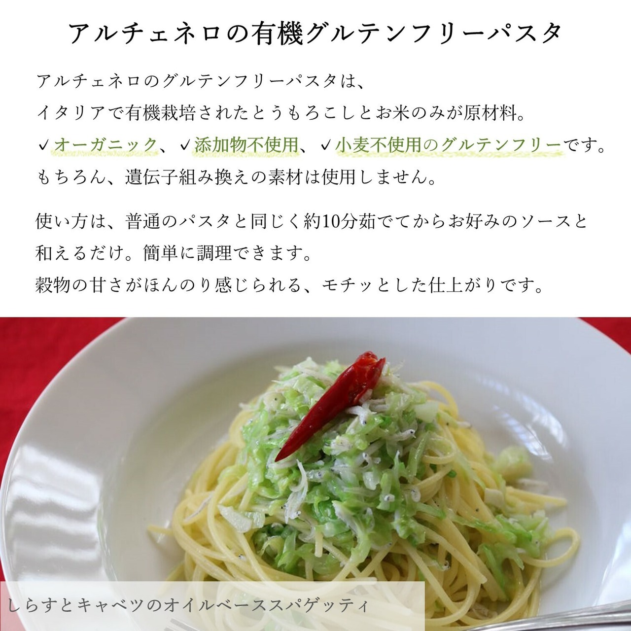 アルチェネロのグルテンフリーパスタは、有機農法で育てられたイタリア産の有機とうもろこしと有機米が原料。