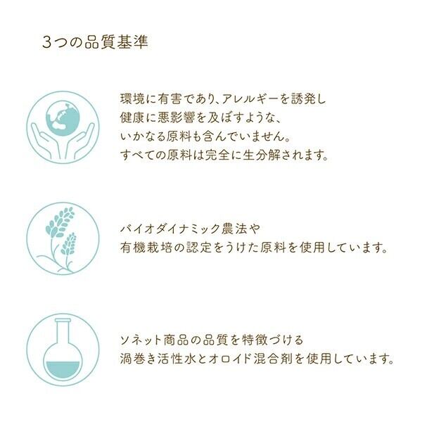 現在の日本の法律では原材料表記の義務がない為、全成分を公開する必要がありません。ソネットは、アレルギーをお持ちの方やどのような原材料で作られているか知りたい方にも安心して使用いただけるよう、全ての成分を公開しています。真摯に製品作りに向き合っているからこそ、原材料はしっかりお伝えすべきだと考えています。
