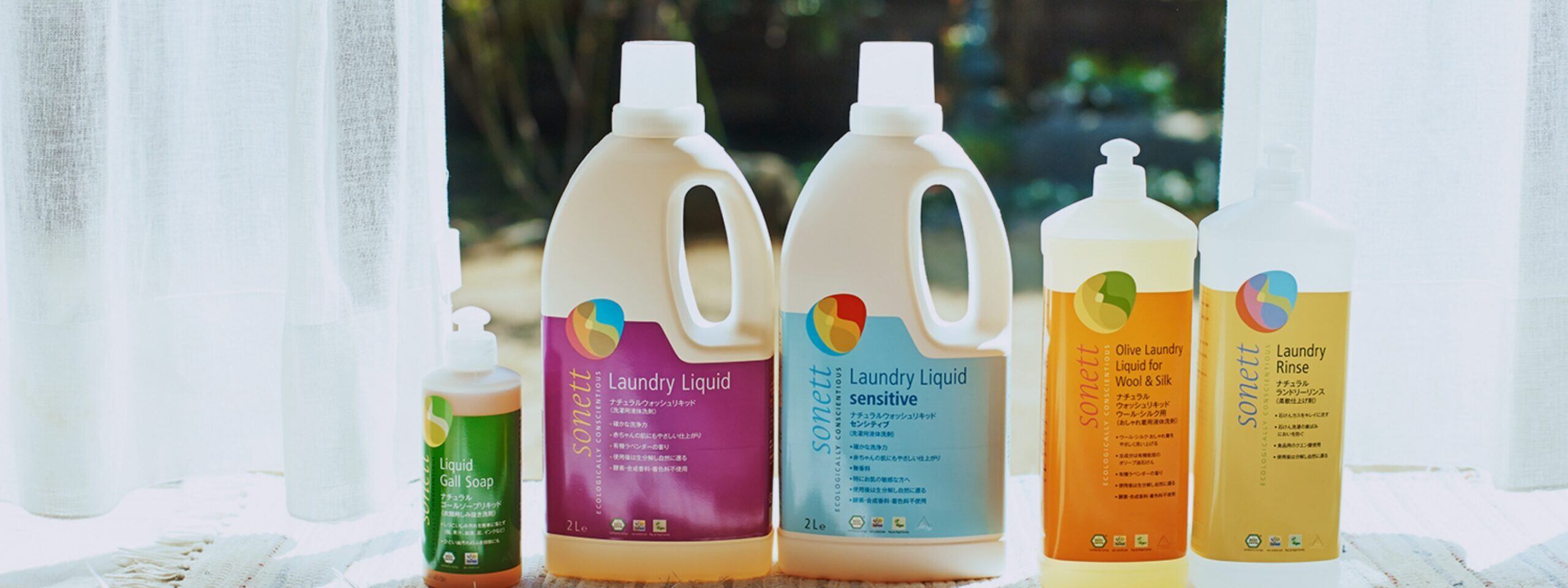 洗浄力はそのままに、人と環境にやさしい生分解性の高い洗剤を作ることをめざし、科学者達が設立したソネット社。オーガニック栽培の植物や天然の鉱物、独自の製法で生命力を与えた水、本物のエッセンシャルオイルなどから作られるソネットの洗剤は、洗剤自らの力で完全に自然に戻ることが証明されています。