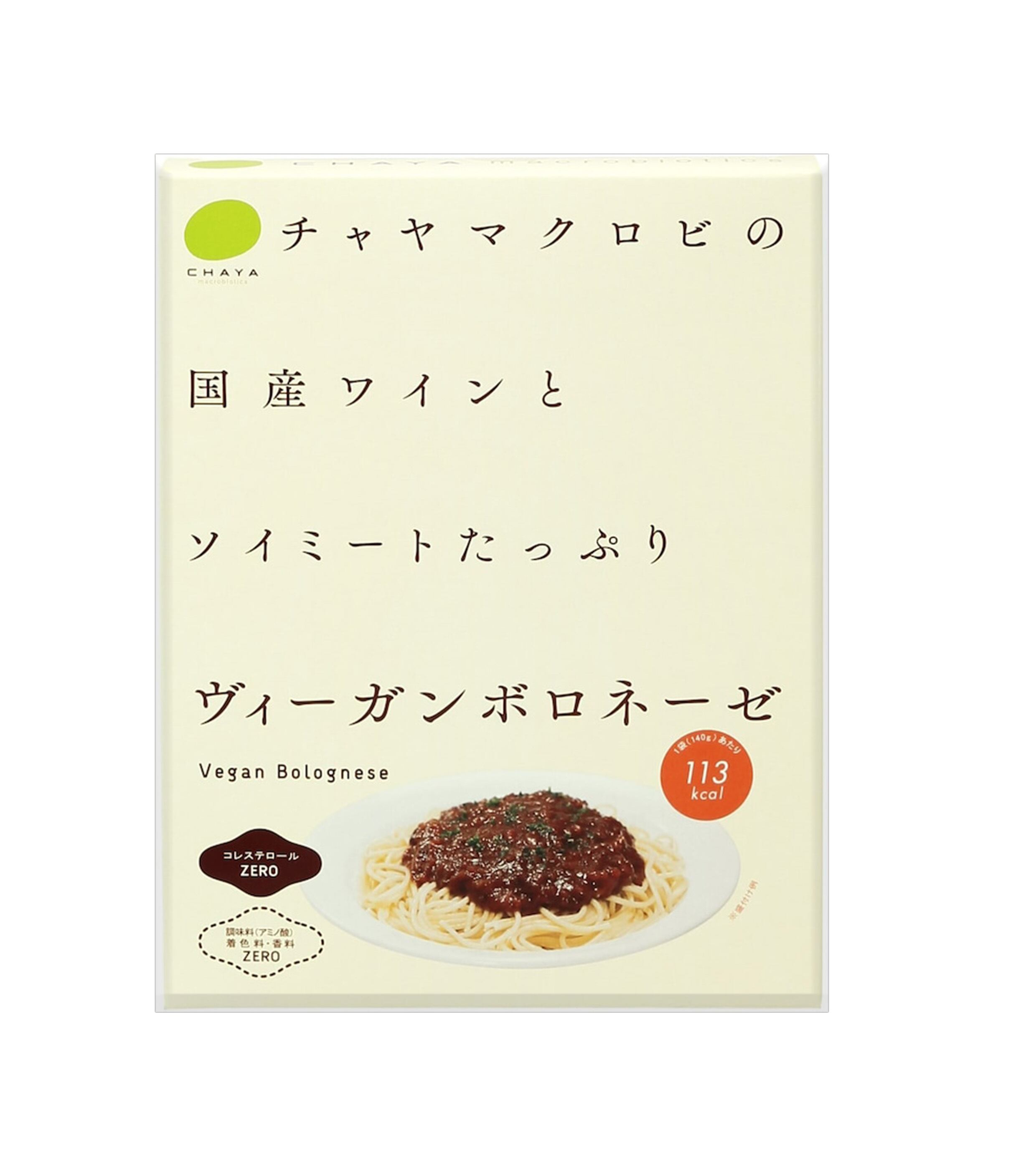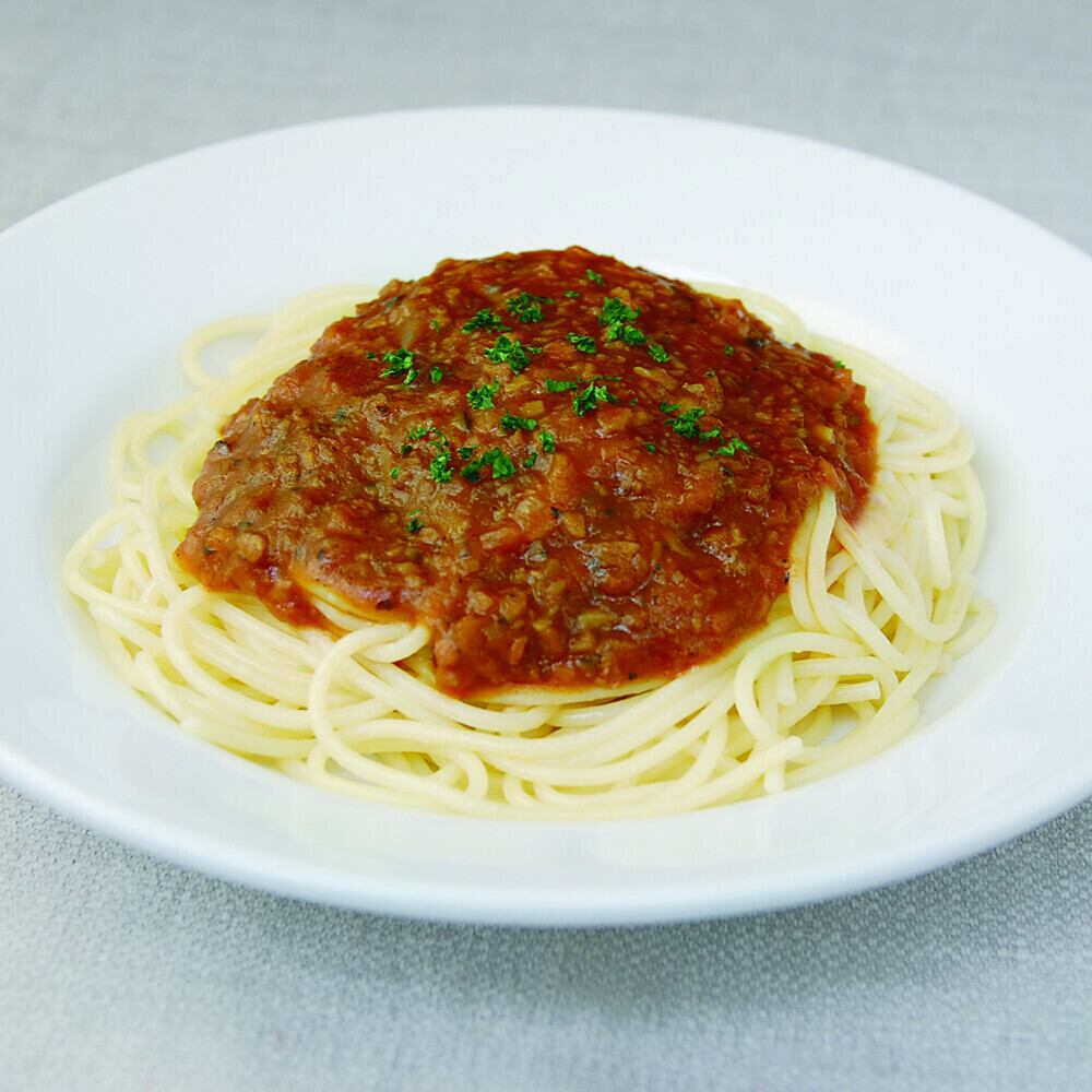 国産ワインの風味引き立つ、ソイミートボロネーゼ。調味料(アミノ酸)・香料・着色料不使用、グルテンフリー、コレステロールゼロ、マーガリン・バター不使用。