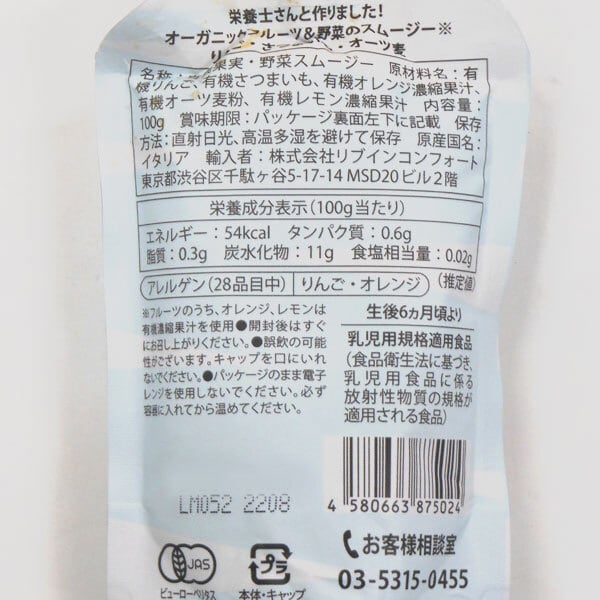有機のりんご・さつまいも・オーツ麦を使用した、見た目もかわいいベビー用スムージーです。