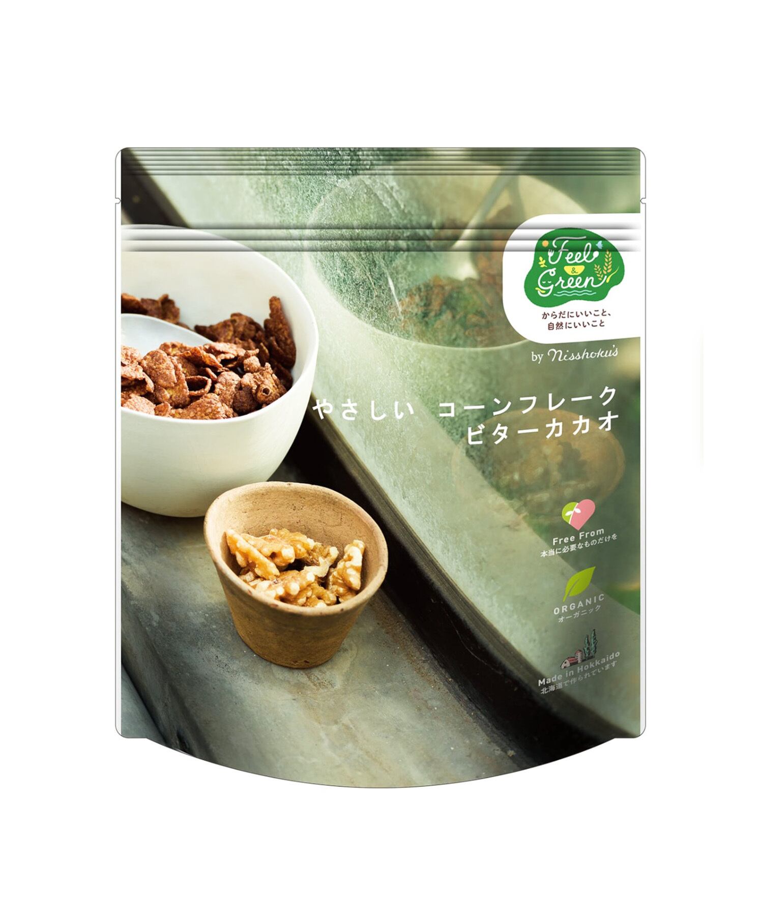 有機JAS認証を取得したオーガニックコーンにオーガニックカカオなど、少ない素材で味付けした、ビターなカカオ味のオーガニックコーンフレークです。