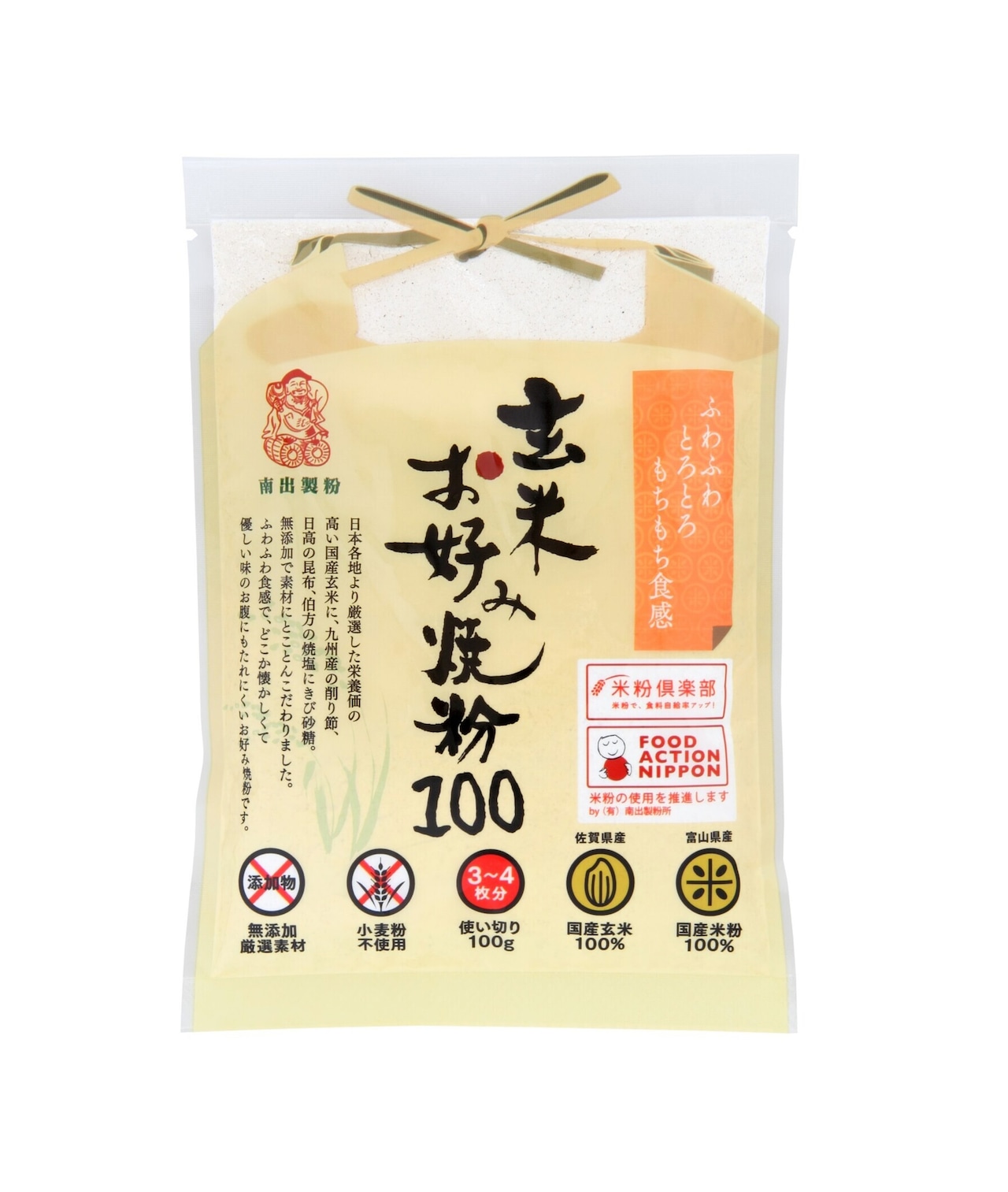 小麦粉は使わず、富山県産米粉や佐賀県産玄米に削り節(さば・かつお・うるめ)と昆布末を配合したお好み焼き粉です。ふわふわの食感に仕上がります。