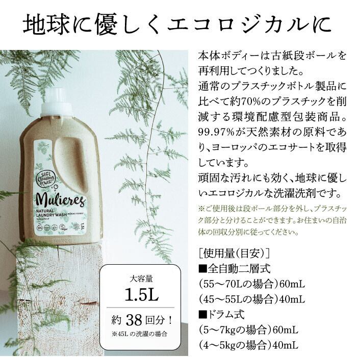 頑固な汚れにも効く!オリーブオイルベースの地球に優しいエコロジカルな洗濯洗剤。古紙ダンボールを再生させた紙製パッケージの本体ボトルタイプ。