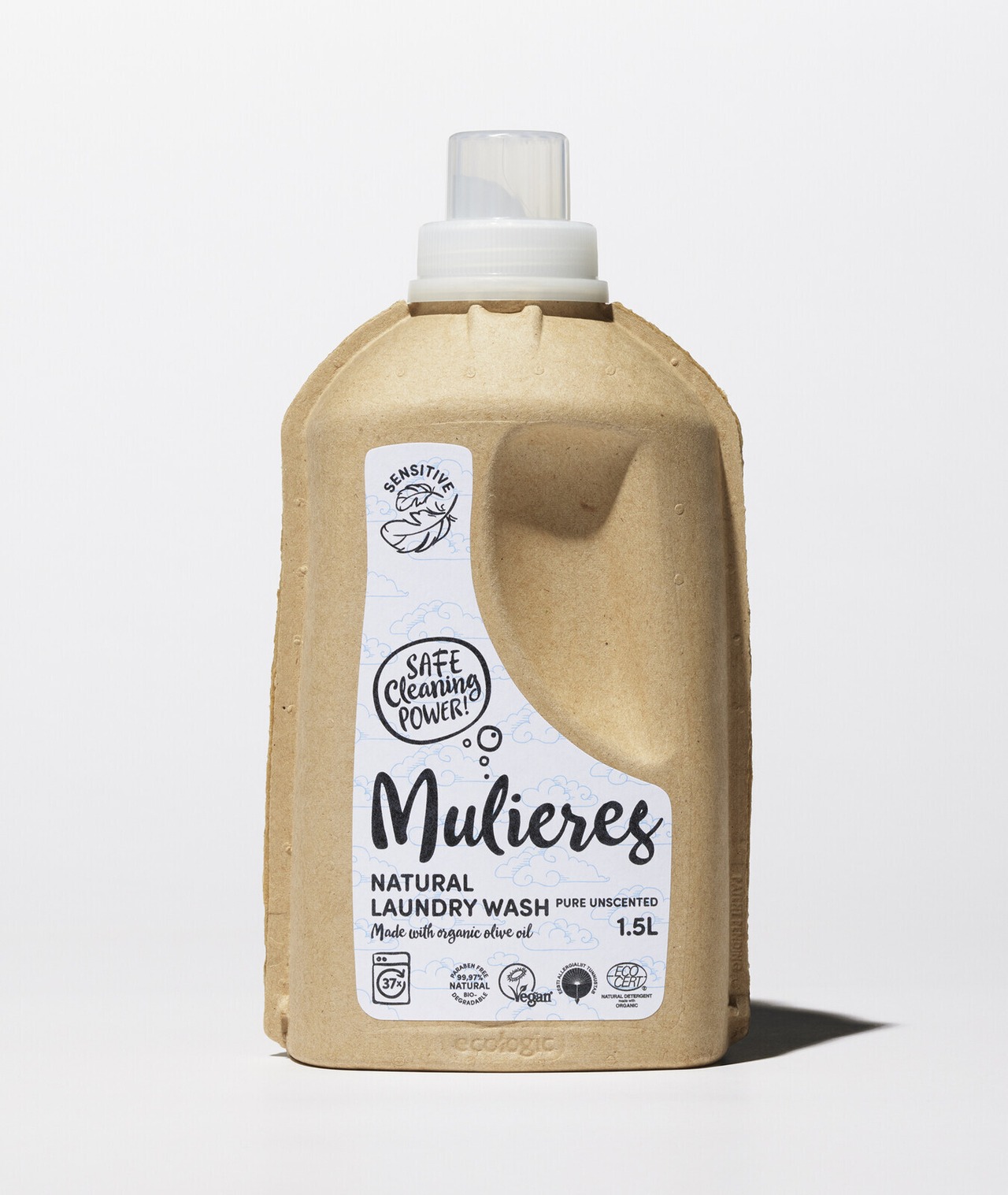 頑固な汚れにも効く!オリーブオイルベースの地球に優しいエコロジカルな洗濯洗剤。古紙ダンボールを再生させた紙製パッケージの本体ボトルタイプ。