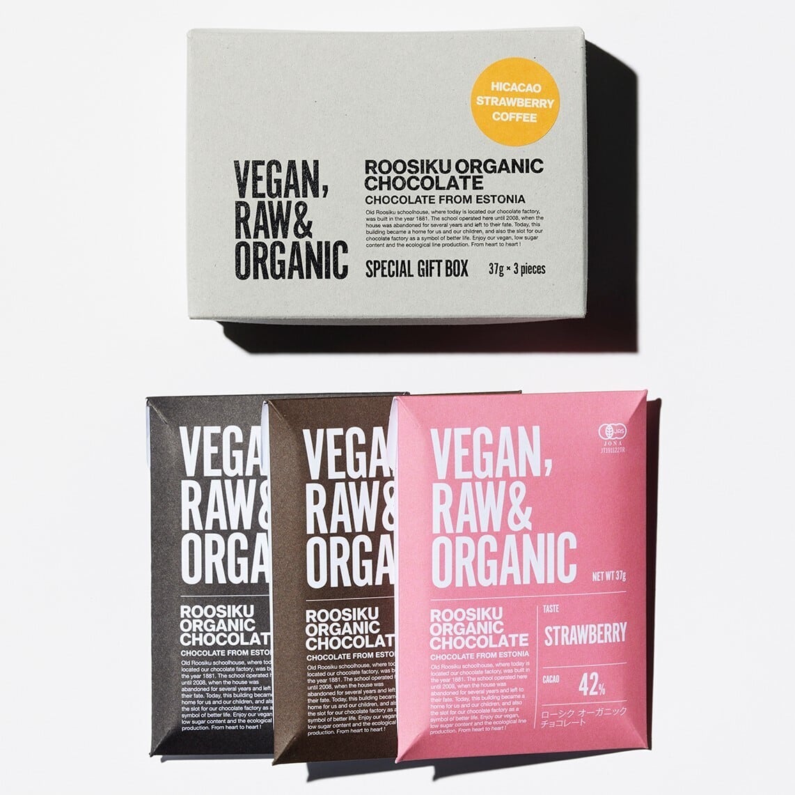 人気のオーガニック・ヴィーガン・ローチョコレートの3枚組。ギフトシーズンに最適。