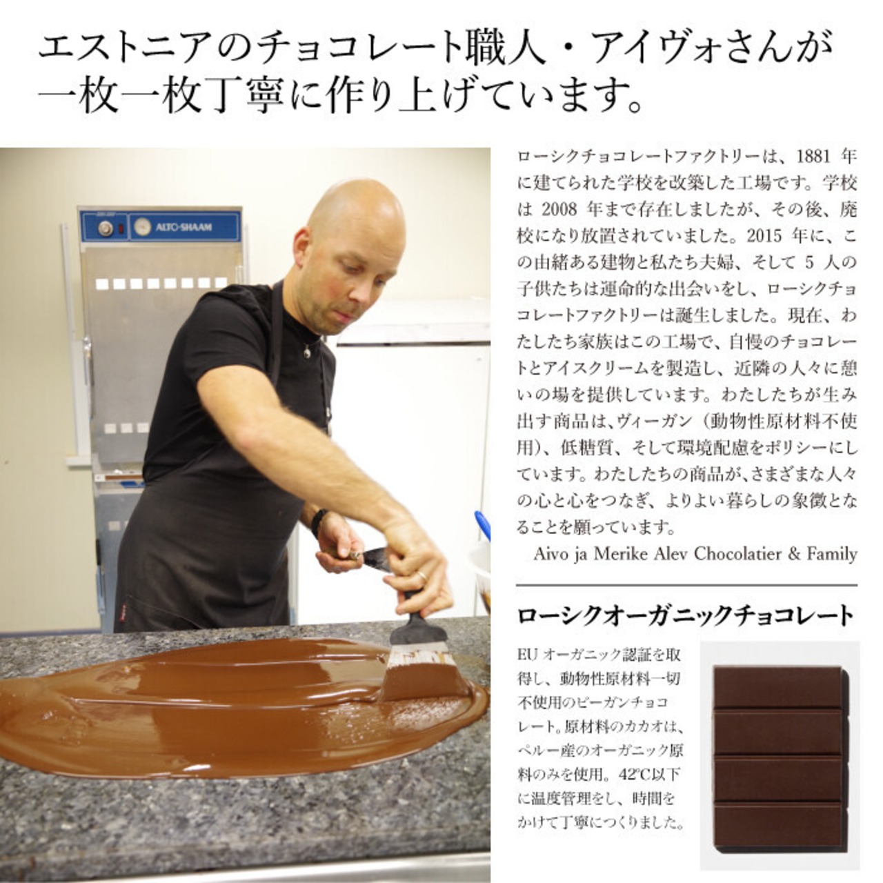 ローシクチョコレートファクトリーは、1881年に建てられた学校を改築した工場です。学校は2008年まで存在しましたが、その後、廃校になり放置されていました。 2015年に、この由緒ある建物と私たち夫婦、そして5人の子供たちは運命的な出会いをし、ローシクチョコレートファクトリーは誕生しました。現在、わたしたち家族はこの工場で、自慢のチョコレートとアイスクリームを製造し、近隣の人々に憩いの場を提供しています。わたしたちが生み出す商品は、ヴィーガン(動物性原材料不使用)、低糖質、そして環境配慮をポリシーにしています。わたしたちの商品が、さまざまな人々の心と心をつなぎ、よりよい暮らしの象徴となることを願っています。