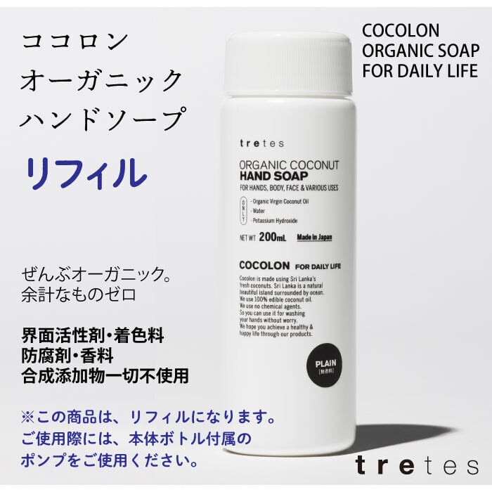ココナッツオイルが元来有する高い洗浄力、保湿力をシンプルに活かした、洗うことに徹したハンドソープ。