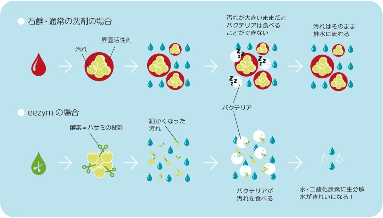 eezymに含まれた酵素は生活排水の中で有機汚れを細かく分解し続け、バクテリアの生分解による生活排水の浄化作用を促進。
