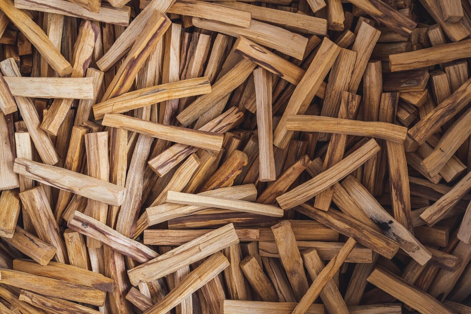 香木であるパロサントのスティックです。天然のお香の一種で、火をつければ即座に部屋を豊潤な香りで満たします。レモンとミントを組み合わせたような、天然の香りをお楽